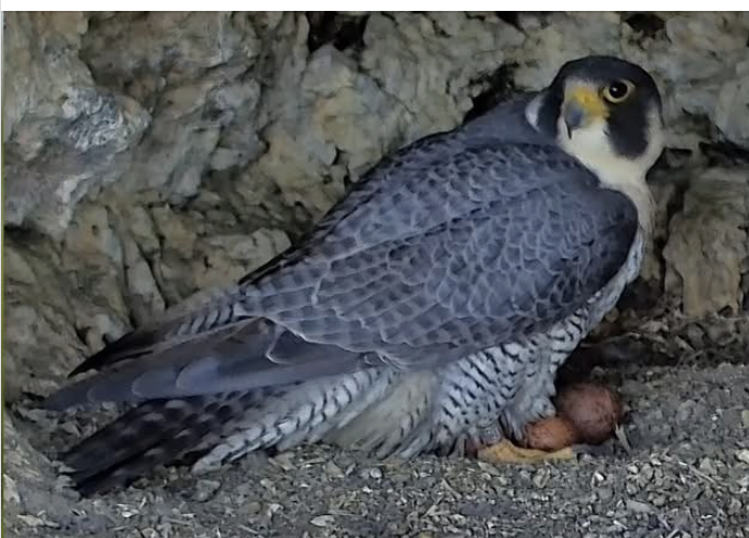 This week's webcam features the Peregrine Falcons of Castle Rock, Wisconsin (Central time). When we tuned in mid-morning, we saw nothing but two eggs. Then we heard vocalizations, and an adult returned to the nest and settled on the eggs, looking at the camera. An entire drama in 30 seconds. (4/2)